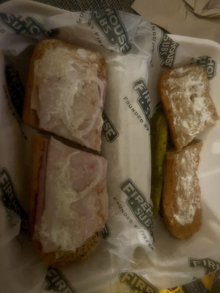 Virginia honey ham and provolone, served Fully Involved (mayo, lettuce, tomato, onion, deli mustard, and a pickle spear on the side).