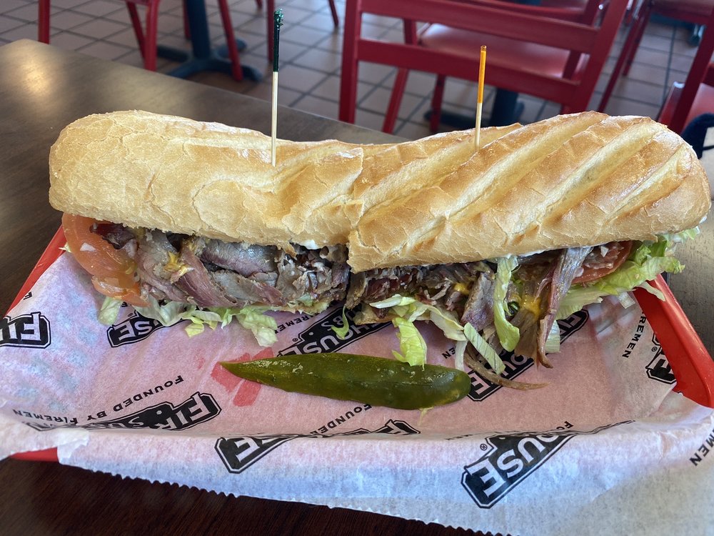 Roast beef and melted provolone, served Fully Involved (mayo, lettuce, tomato, onion, deli mustard, and a pickle spear on the side).
